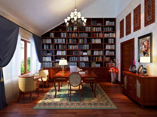 書房:書房是房主人用來辦公學(xué)習(xí)的地方,中式田園風(fēng)格的書房自然不能少了清幽淡雅的感覺。對于中式田園風(fēng)格書房的設(shè)計,田園的氣息要從細微之處體現(xiàn)整體上則要以平間簡潔的元素為主。綠色是大自然的主打顏色,啞綠作為書房的主色調(diào),可使得這個書房即雅致有很有穩(wěn)重感,與淡綠色的窗簾相呼應(yīng),甚是和諧。當然,深木色的主題色調(diào)也是很適用于中式田園風(fēng)格書房的色調(diào),沒有雕工細膩繁雜的雕花,少了那份柔美,卻多了幾分硬朗,與書房氣氛相得益彰。