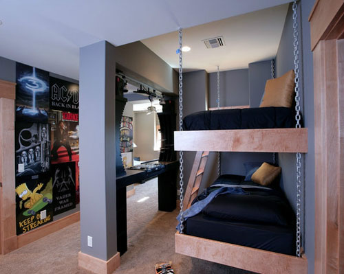 再來(lái)看看這款設(shè)計(jì),整間房屋的色調(diào)給人感覺(jué)較為硬朗。上下鋪的設(shè)計(jì)摒棄了以往的設(shè)計(jì)理念,進(jìn)而注入了新的創(chuàng)想。采用鎖鏈吊掛的方式組成了一組上下鋪,很符合這間房屋設(shè)計(jì)的風(fēng)格。由此可能看的出,這是一款很適合家有男孩子的家庭使用。