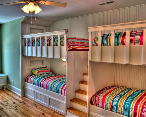 彩虹樣式的床品搭配白色的雙層床,新穎又時(shí)尚,讓人看了就心情大好。木制的地板及臺(tái)階可很符合這間屋子的整體感覺(jué)。想象一下要是學(xué)校的宿舍能裝修成這個(gè)樣子是不是很有愛(ài)呢。